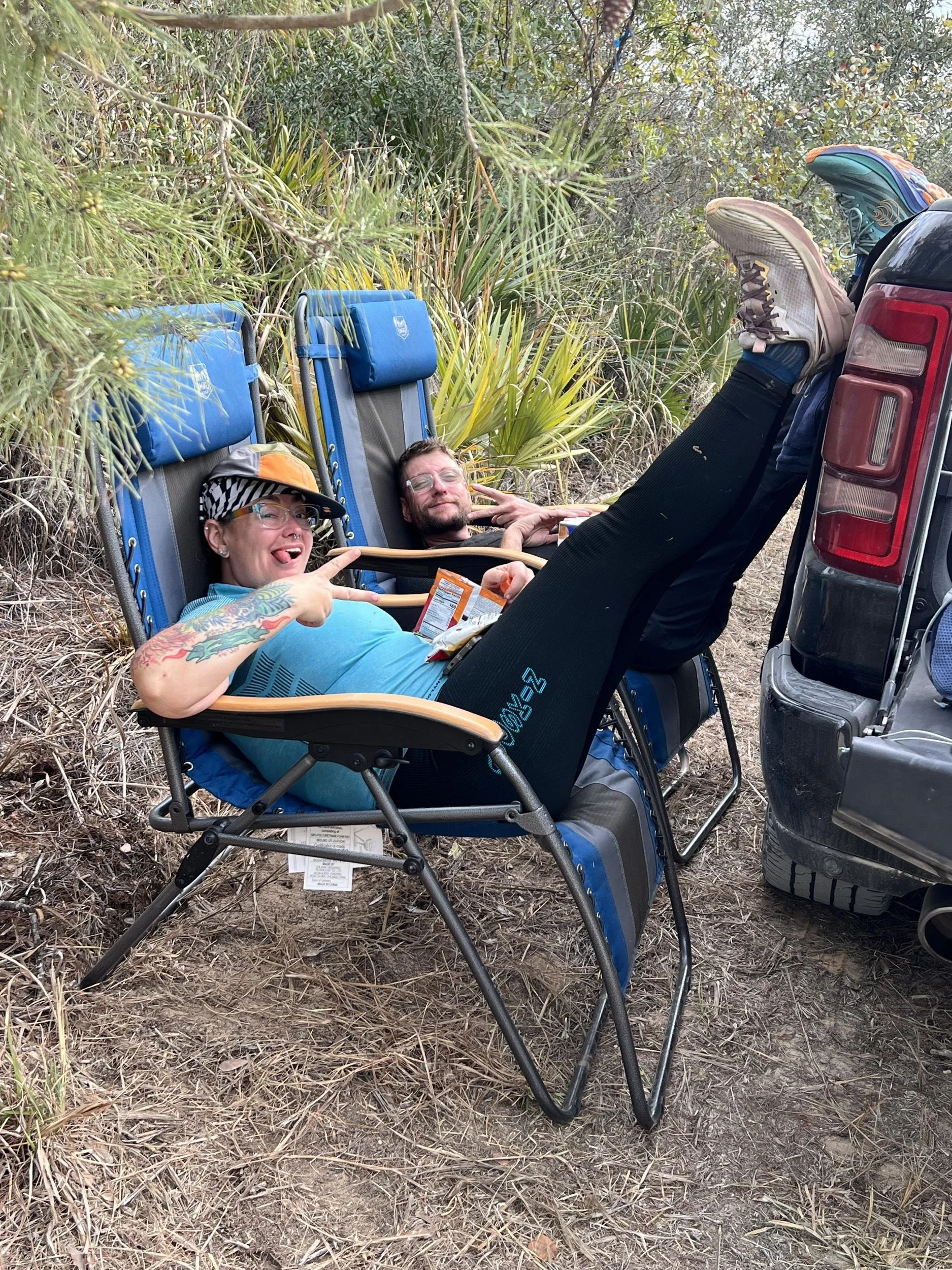 We came through the woods at 200 to see Chris and Laura with pizza!! We sat in our chairs, me with a blanket over me because I needed my fuzzy kitten blanket every time I sat down. We ate pizza and then went out once again. This would be one of the hardest sections with all of the Florida “hills.” We knew the rain would be coming in and the forecast said it would be starting right when we got to the Pruitt Trailhead. Unfortunately, that was not the case at all.