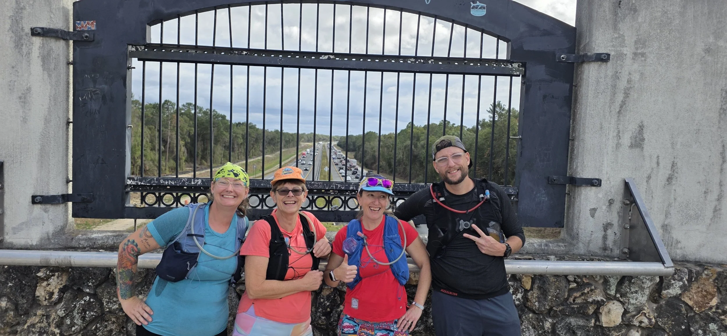 During those last few miles, I sat on several benches; my dogs were BARKING. When we crossed the Ocklawaha River, we saw a gator! I had planned a crew stop at mile 146ish and Joe had parked there to walk up to us to chat, and I apologized profusely for being a butthead and not believing him. Now that we were about a mile from the finish, I was so ready to be done. Tyler and Kevin tried to get me to run, but my calves were not having it. He peeled off when we had about a 10th of a mile to go and we jogged it in for form’s sake.